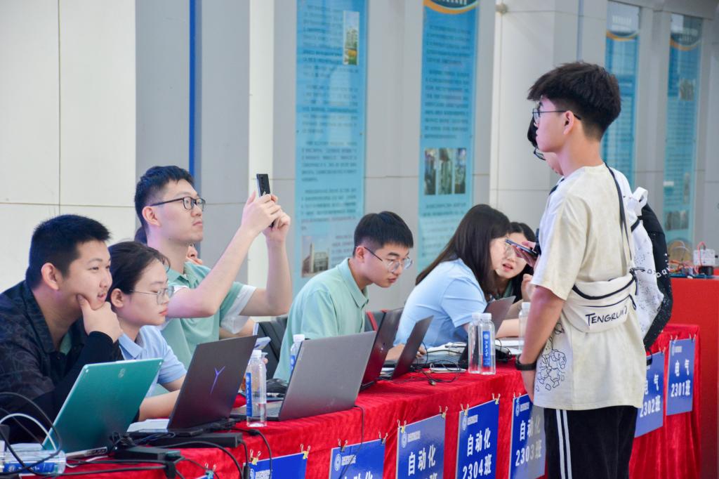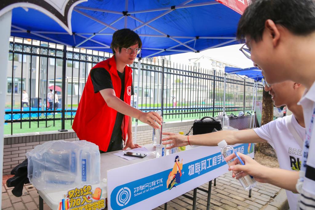 此次迎新,学院组织了以新生班主任助理和学长学姐为主体的志愿服务队,在报到现场和宿舍园区进行引导,给予新生最温暖的问候。在报到现场,设置了三个特色体验区。“物联天下”展板区采取曲度箭头设计,以新生照片组成立体“物联天下”字样,意蕴五湖四海优秀学子共同汇聚向物联;“科创体验区”集中展陈学院学生在历届科创竞赛中设计制作的机器人、智能车等,新生现场操作体验,纷纷表达了对未来大学生活的期待和憧憬;“寄语抽奖区”以手写蝴蝶卡片祝福语的方式获取抽奖机会,极大提升入学报到的参与感,学院定制文创产品也带给新生认同感和归属感。