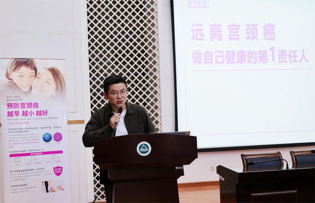讲座伊始,刘鹏超援引真实案例向同学们介绍了宫颈癌的病情,他详细解读了宫颈癌的患病原因,系统介绍了HPV病毒对身体免疫的威胁以及宫颈癌患病之后的治疗负担,指出宫颈癌发病不分人群、不分年龄、且呈现年轻化的趋势,从而进一步明确宫颈癌预防的重要性。接着,刘鹏超从预防策略、防控重点、接种要点、疫苗对比等方面鼓励同学们积极主动进行宫颈癌预防,将宫颈癌扼杀在摇篮之中。他强调,鉴于宫颈癌早期症状不明显,接种疫苗以及定期筛查是预防宫颈癌最有效的措施,全程接种HPV疫苗后再进行2-3年一次的HPV定期筛查是中国最具成本效益的优先策略。最后,刘鹏超与雪浪卫生服务中心的工作人员与现场同学展开互动交流,耐心细致地回答学生提出的问题,并针对不同年龄段的女性给出了实用有效的防护建议。