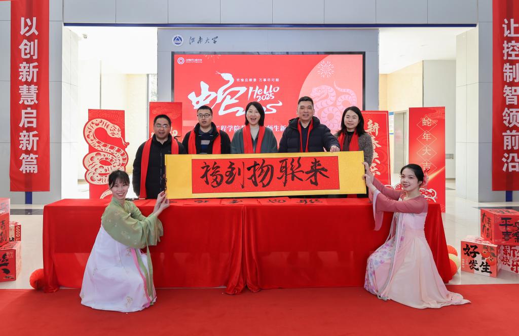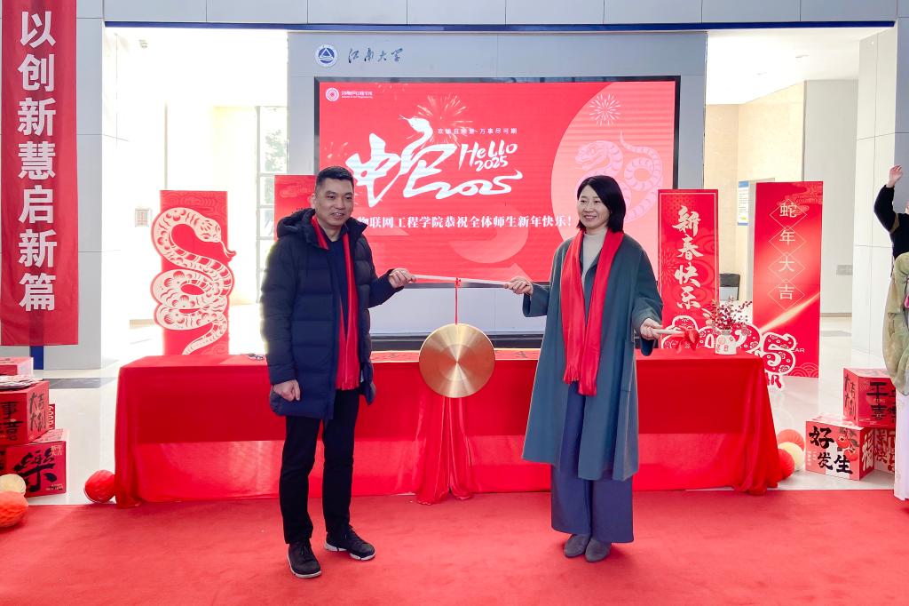 为弘扬传统文化,共筑物联新风,12月31日,物联网工程学院在学院大厅举办“巳巳如意,福满物联”2025新年游园会活动,喜迎元旦,欢度佳节。学院党委书记张华,院长栾小丽,党委副书记兼副院长吴妍,副院长陶洪峰、郭亚,院长助理等与广大师生欢聚一堂,共贺新年。
