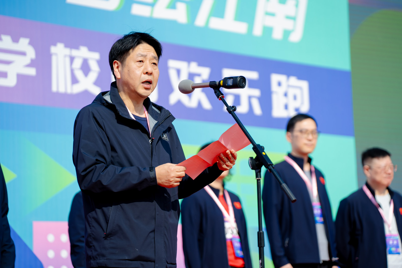 江南大学党委书记吴正国,党委副书记倪松涛,党委常委、党委组织部部长张梁,校长助理、山东第一医科大学副校长马鲁豫,体育部主任秦永和以及中国工商银行无锡分行行长徐碧云,副行长张晔蕴、杜敏,高级经理徐洪春等领导出席了起跑仪式。倪松涛致开幕辞。他在致辞中指出体育是强国之基,健康是奋斗之本,希望全体参赛师生和校友在欢乐奔跑中尽情展现,跑出突破自我的“江南速度”、跑出携手同行的“江南风采”,更跑出担当奋进的“江南自豪”。吴正国宣布开赛。比赛在热情洋溢的赛前热身操中拉开帷幕,吴正国、徐碧云为比赛鸣枪,倪松涛、张梁、王维、单筱婷、黄锋林、周伟涛、周云龙等领导作为领跑者,带领参赛的师生校友从体育中心跑道奔涌而出,踏上了充满挑战与活力的赛道。