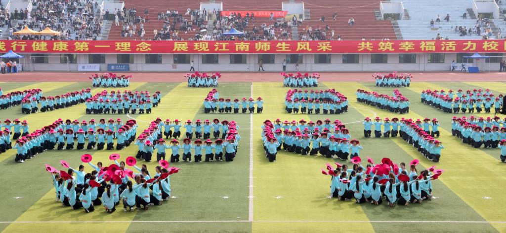 随后进行的是开幕式表演。教职工八段锦表演,起承转合间似行云流水,刚柔相济中尽显气韵生动,将中华传统体育的千年风骨娓娓道来,也诉说着江南人对文化根脉的深情守望。大型团体操《与时代共舞》将气氛推向巅峰,800名学子帽影翻飞,随乐律动,挥洒出与时代同频共舞的青春誓言。队形流转间,“WE LOVE SPORTS”字样次第呈现,个体与集体的共振,在此刻得到完美诠释。