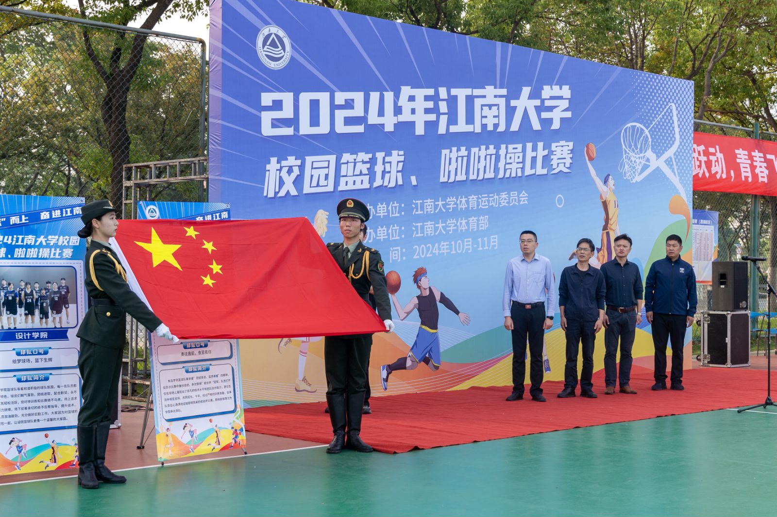 10月14日,江南大学2024年大学校园篮球、啦啦操比赛正式开幕。江南大学团委书记魏珍吉、体育部党总支书记周建中、体育部主任秦永和、副主任赵来安出席了本次开幕式。