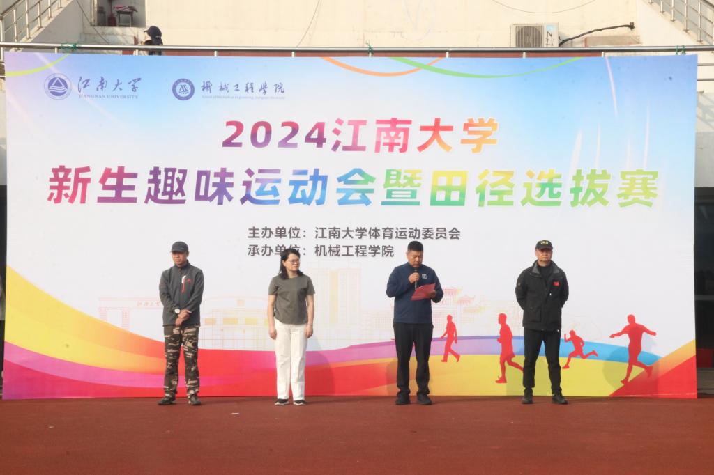 11月3日,2024江南大学新生趣味运动会暨田径选拔赛于体育中心举行。本次比赛由江南大学体育运动委员会主办,机械工程学院承办。机械工程学院党委副书记兼副院长刘升恒,体育部副主任赵来安,体育部群体竞训中心负责人龚宁、裁判长余亮出席了开幕式。开幕式上,运动员代表王宝库与裁判员代表卢宇轩分别进行了宣誓,体育部副主任赵来安致辞并宣布开赛。