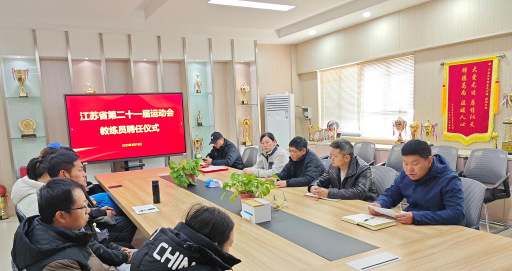 会上,赵来安宣读了《关于我校参加江苏省第二十一届运动会教练员聘任的通知》。本次省运会,我校将组建田径、球类、武术、健美操、游泳、跆拳道等14支参赛队伍,周建中和秦永和为教练员颁发了聘书。