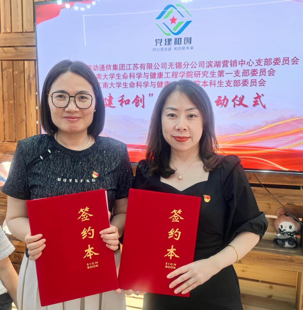 接着,孙颖代表生命科学与健康工程学院研究生第一党支部及本科生党支部,瞿静代表中国移动通信集团江苏有限公司无锡分公司滨湖营销中心党支部,共同签署了“党建和创”共建协议。