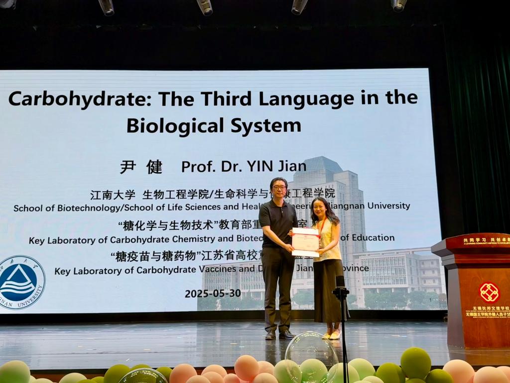 5月30日上午,江南大学生命科学与健康工程学院院长、国家级人才项目获得者尹健教授应邀赴无锡狄邦文理学校(原无锡南外国王国际学校),为该校初中部400余名七至九年级学生带来了一场主题为“Carbohydrate: The Third Language in the Biological System”的科普讲座。