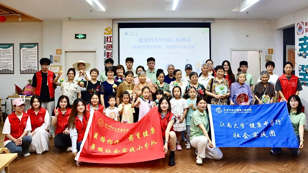 7月9日下午,江南大学生命科学与健康工程学院“健康中国行”研学实践团、无锡药安志愿服务队联合杭州师范大学药学院“医路相伴 药育健康”实践小分队走进杭州葛巷未来社区,开展“体重管理传妙策,健康科普惠万家”科普宣讲活动。