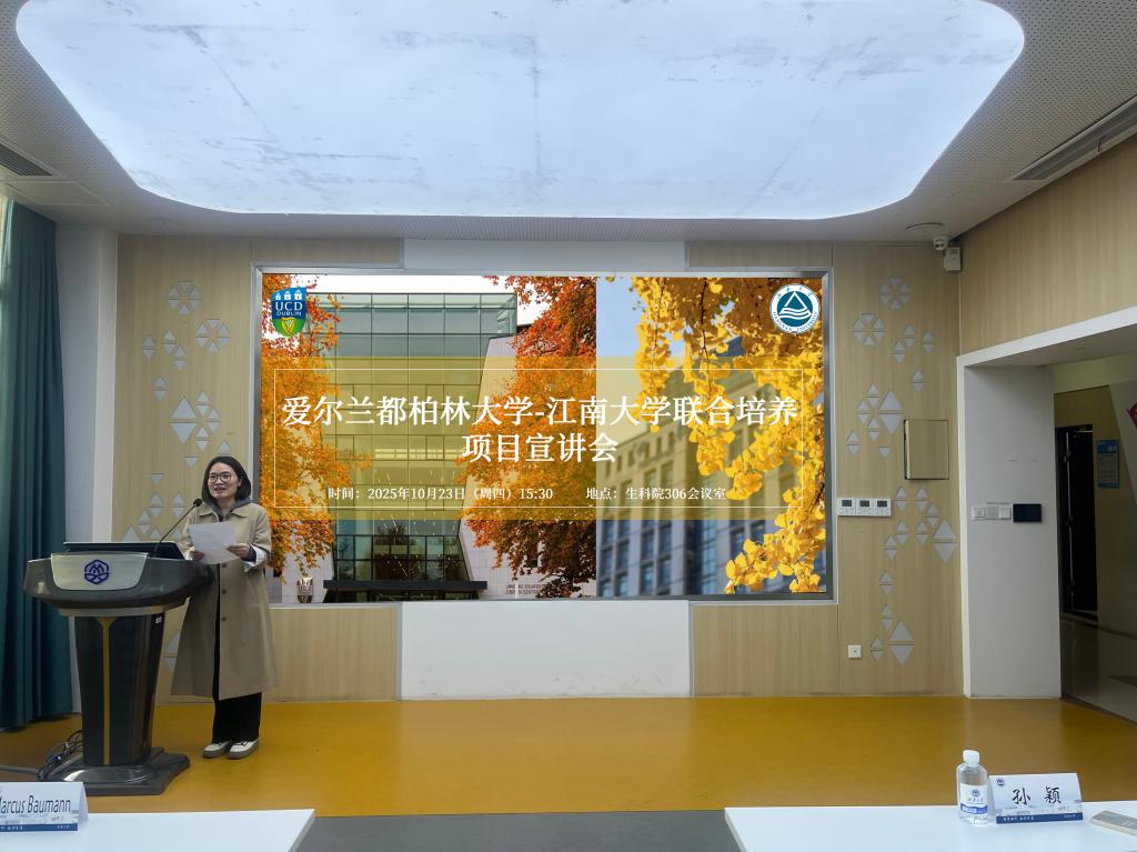 10月23日下午,爱尔兰都柏林大学—江南大学联合培养项目宣讲会在生命科学与健康工程学院306会议室举行。爱尔兰都柏林大学东亚中心副总监Edar Yu先生、教授Marcus Baumann先生,以及学校国际交流合作处田泽宇老师出席会议。会议由生命科学与健康工程学院党委副书记、副院长孙颖主持。