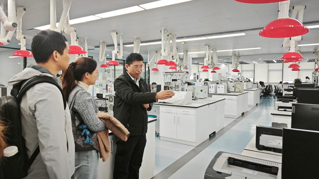 随后,潘西海为师生系统介绍了研究院的组织架构、研发方向与平台建设情况。潘西海指出,新华制药研究院以“四中心”为核心,聚焦新药研发、工艺优化与技术创新,构建了较为完善的研发体系。在潘西海的引导下,师生实地走访了多个专业实验室,近距离观摩了药物研发流程与实验操作。通过现场讲解与互动交流,大家对企业在药物研发方面的技术实力与创新能力有了更为直观的认识,也对医药行业的未来发展趋势与专业素养要求有了更深层次的理解。