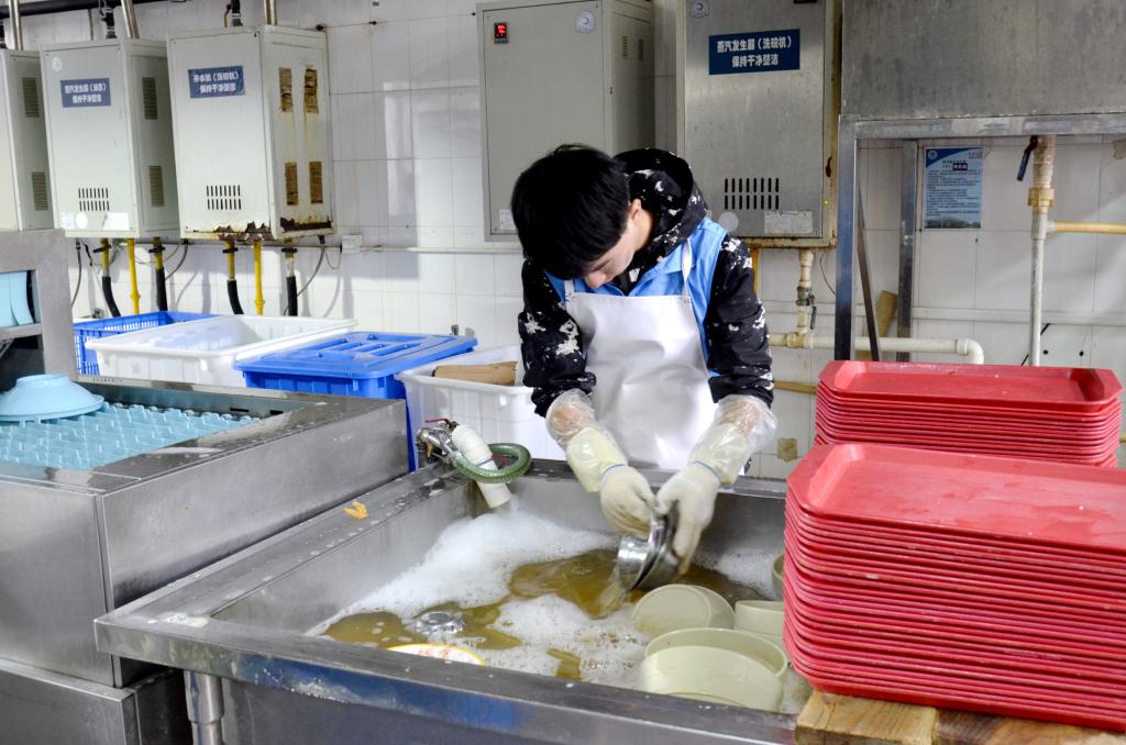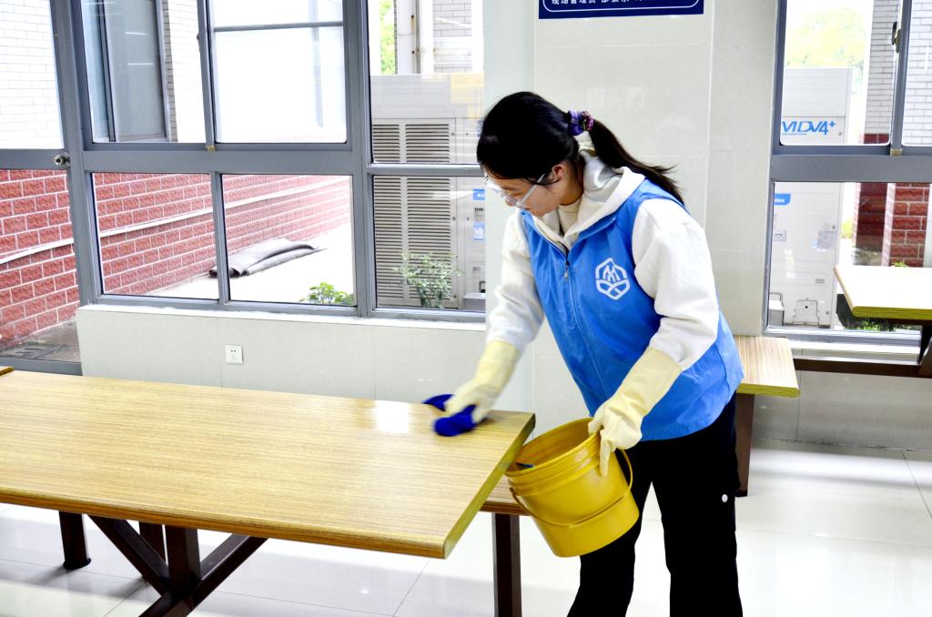 活动伊始,志愿者们统一着装,在江南苑食堂集合。食堂负责人张经理为志愿者们分配了具体任务。在工作人员的指导下,大家分组开展餐桌整理、餐具清洁、厨余处理等工作。志愿者们还主动与食堂工作人员进行交流,倾听他们的工作体会,结合专业所学分享冬季健康科普知识,在劳动中传递温暖与关怀。