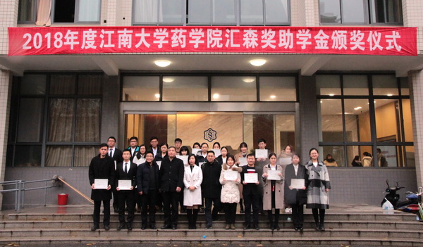 1月9日,2018年度江南大学药学院“汇森奖助学金”颁奖仪式在药学院306会议室隆重举行。汇森生物设备镇江有限公司财务总监吴纪福,行政人事总监陈佑,药学院副院长史劲松,院党委副书记、副院长白冰出席颁奖仪式。仪式由药学院分团委副书记任学敏主持,20名获奖学生及部分观礼学生代表参加了颁奖仪式。