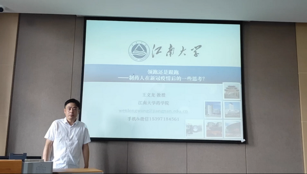 王教授围绕“领跑还是跟跑——制药人在新冠疫情后的一些思考”为主题,从年初出现的新冠疫情作为话题导入,阐述了我国对于这场突如其来的疫情所做的措施,同时讲述了国外对于疫情的应对措施,可以看出我国对于这场全人类的灾难做出了巨大的贡献。王教授从专业的角度为在场同学讲述了SARS-COV2这个病毒的相关知识与现有的对病毒的认识,使同学们对这个病毒有了更为深入的认识和了解。
