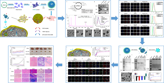 研究人员通过基因工程技术将编码多聚组氨酸、基质金属酶切序列和肿瘤靶向肽的基因与HSA基因进行重组,构建了多功能白蛋白融合蛋白。该融合蛋白中可通过多聚组氨酸的亲水-疏水转换作用,自组装制备载抗肿瘤药物紫杉醇的纳米粒。该纳米粒在保持Abraxane优点的基础上,赋予了肿瘤部位靶向蓄积、核壳分离促进摄取、胞内敏感释药的“三级推进”功能,体内外实验均表现出更优的抗肿瘤效果。该研究提出了一种新的生物制造智能化药物载体的策略,在抗肿瘤药物精准递送方面具有广泛的应用前景,已获批国际发明专利。