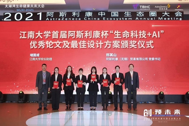 4月23日,获得“最优设计方案奖”和“最优论文研究奖一等奖”的团队代表还受邀参加了在无锡市新吴区举办的“2021阿斯利康中国生态圈大会”,江南大学校长助理堵国成和阿斯利康(中国)贸易有限公司党委书记邢其山共同为获奖学子颁奖。