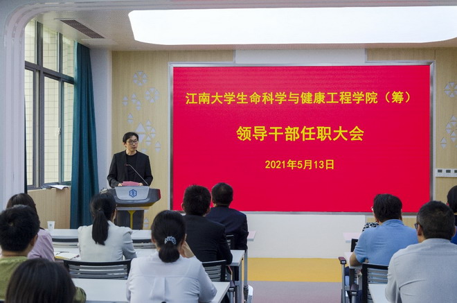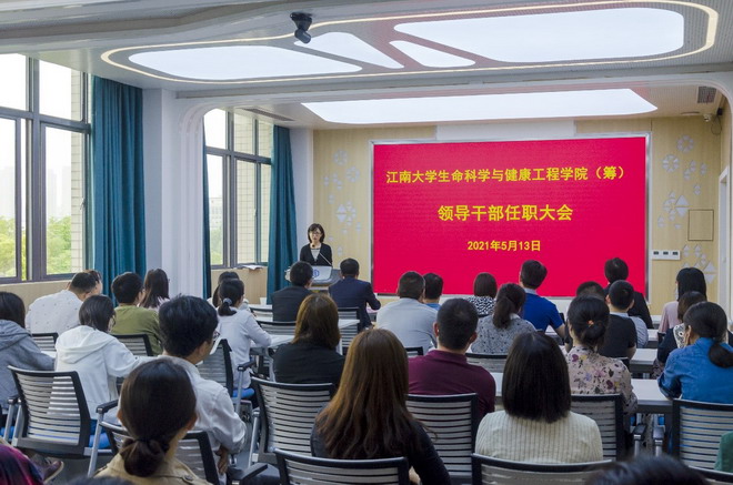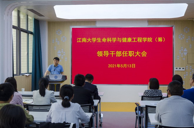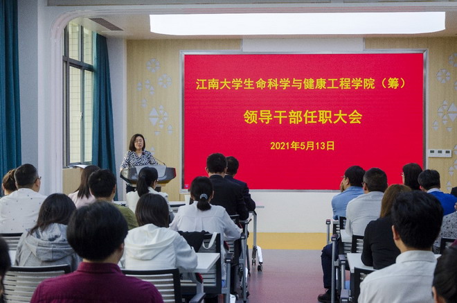5月13日下午,江南大学生命科学与健康工程学院(筹)领导干部任职宣布大会在药学院306会议室举行,校长陈卫,校党委常委、党委组织部部长张影陆出席会议,药学院全体教师参加会议,会议由药学院党委书记陈霞雯主持。
