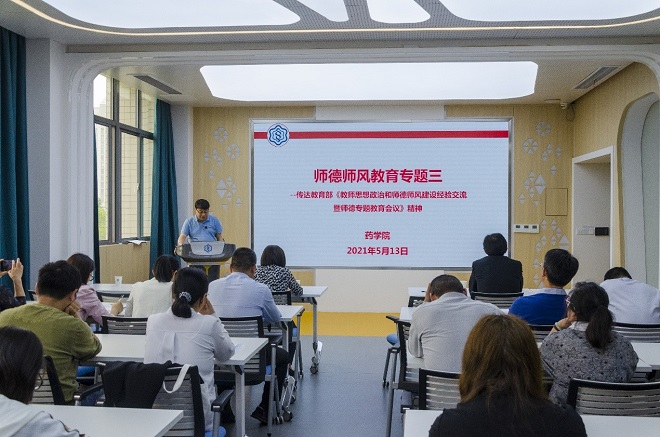 之后,会议进行药学院第三次师德师风专题教育。院长陈敬华传达了教育部“教师思想政治和师德师风建设经验交流暨师德专题教育会议”上陈宝生部长的重要讲话精神,指出教师思想政治和师德师风建设工作是凝心铸魂、立德树人的基础性工程。教育部党组将2021年确定为“高校教师思想政治工作强化年”,持之以恒抓好落实。