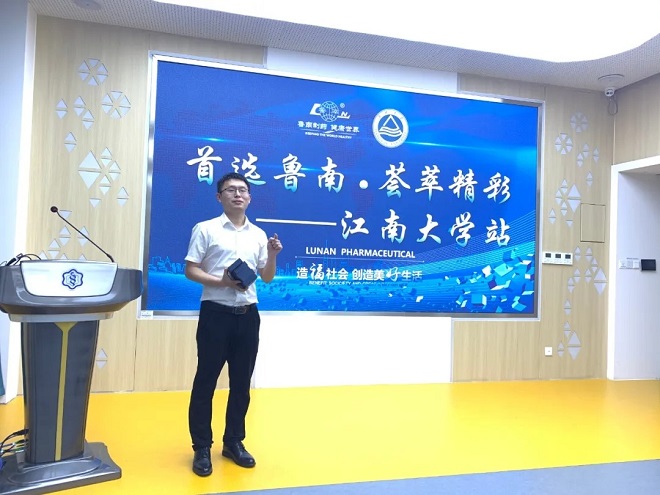 沂蒙精神宣讲结束后,鲁南制药人力资源部韩炜炜经理向与会的同学详细介绍了公司现状、发展远景、员工福利、实习生招聘等内容。药学院党委副书记、副院长白冰,办公室主任徐贻学,药学系主任邱立朋等还参加了校企座谈会,双方就科研合作、研究生联合培养、暑期实习、夏令营等方面展开深入探讨并达成初步合作意向。