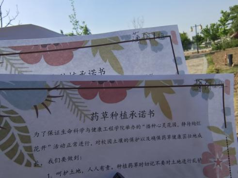 活动开始前,学院21级心理协会成员以及本次活动的志愿者们提前来到了百草园,负责药草幼苗,种植工具以及肥料等种植物品的搬运,为同学们布置好种植场地。随后,各“药草种植小分队”签署《种植承诺书》并有序领取《药草养护指南卡片》,种植工具以及“药草宝宝”,在指定的种植区域开启种植。同学们在吴湘娟的细心指导下,严格按照药草种植的要求,把控好种植间距以及种植的深度,小心地将药草幼苗放入土坑中,覆上泥土,并用小水壶耐心地将幼苗根部的土壤润湿。同学们全身心得投入种植活动之中,放松心情,充分地享受种植的乐趣。活动的最后,每一个小分队都完成了本组种植任务,安置好了每一株“药草宝宝”并将种植工具放置在统一回收处。
