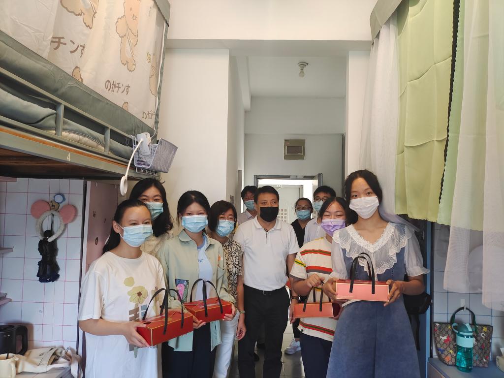 学院党委坚持一线工作原则,坚持以学生为中心。在一年一度的中秋节来临之际,9月9日下午,院党委书记陈霞雯、院长陈敬华、党委副书记兼副院长蒋艳,年级辅导员、新生班主任、副班们一行,带上学院定制的中秋月饼,深入新生宿舍看望新生,全面细致地了解新生的基本情况,亲切询问同学们对于无锡的气候饮食是否习惯,关心住宿环境,倾听同学们的感受,了解家庭困难学生有无需要学院提供帮助的地方,并耐心细致地回答学生问题,为新生送去温暖与问候。学院领导鼓励同学们要把握大学时光和机遇,尽快转变学习方式,以积极饱满的状态站在新的起点,秉持终身学习的态度,不负韶华,树立远大理想,为将来贡献“健康中国”做好准备;希望同学们要珍惜舍友缘分和情谊,相互照应,共同成长,尽快适应大学生活,在新的环境里多方面提升自己;提醒同学们要加强体育锻炼,提高身体素质,疫情常态化防控期间,同学们要保持良好的心态,共同营造健康安全的学习生活环境。