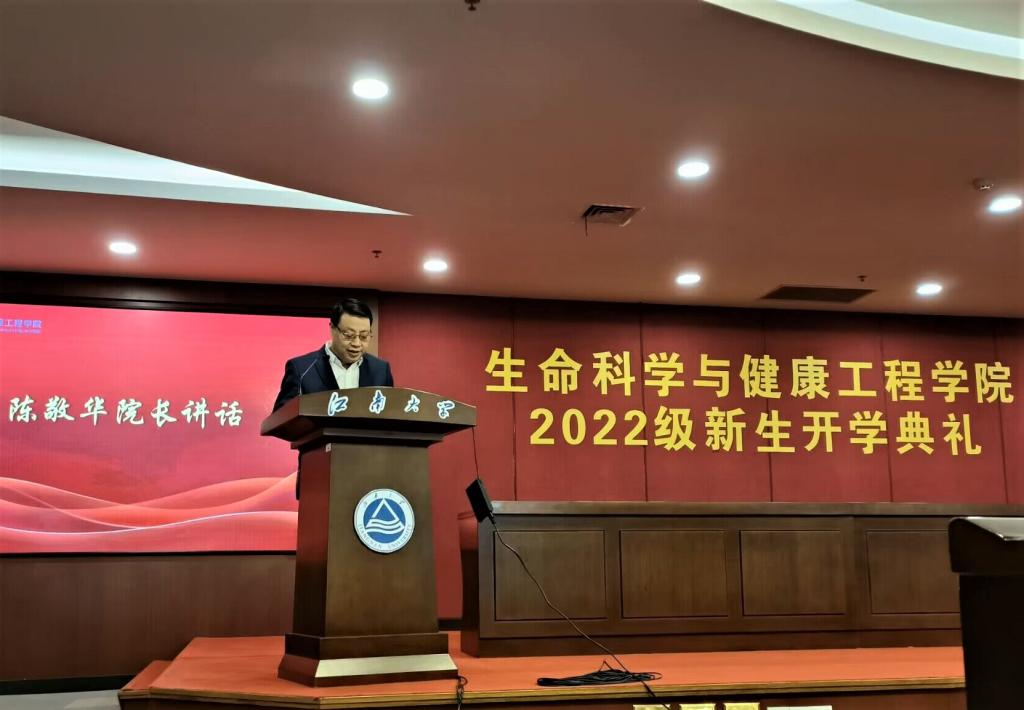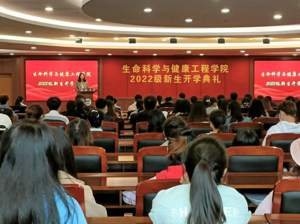 随着国庆节后最后一名新生返校,10月7日下午,生命科学与健康工程学院2022级全体新生线下大团圆,欢聚一堂,在图书馆510多功能厅举行2022级新生开学典礼。学院党委书记陈霞雯、院长陈敬华、常务副院长尹健、副院长李会、副院长吴静,制药工程系副主任闻建、药学系副主任周娟,学院教授代表及新生班主任出席了本次活动。开学典礼由学院党委副书记兼副院长蒋艳主持。