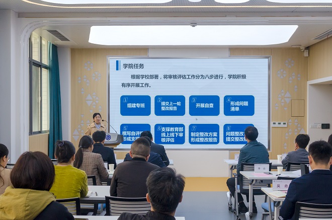 最后史志洪代表学院表态,表示学院上下将努力打造全员参与、全线协作、全面落实的迎评促建局面,积极对标找差,认真开展自评自查工作,加强教学规范建设,提高教学质量和水平,全面提升本科人才培养质量,全力以赴推进各项工作落细落实,保障学院本科教育教学审核评估的工作顺利完成。