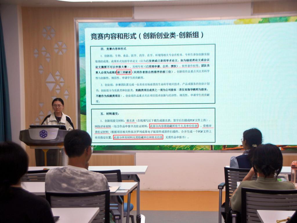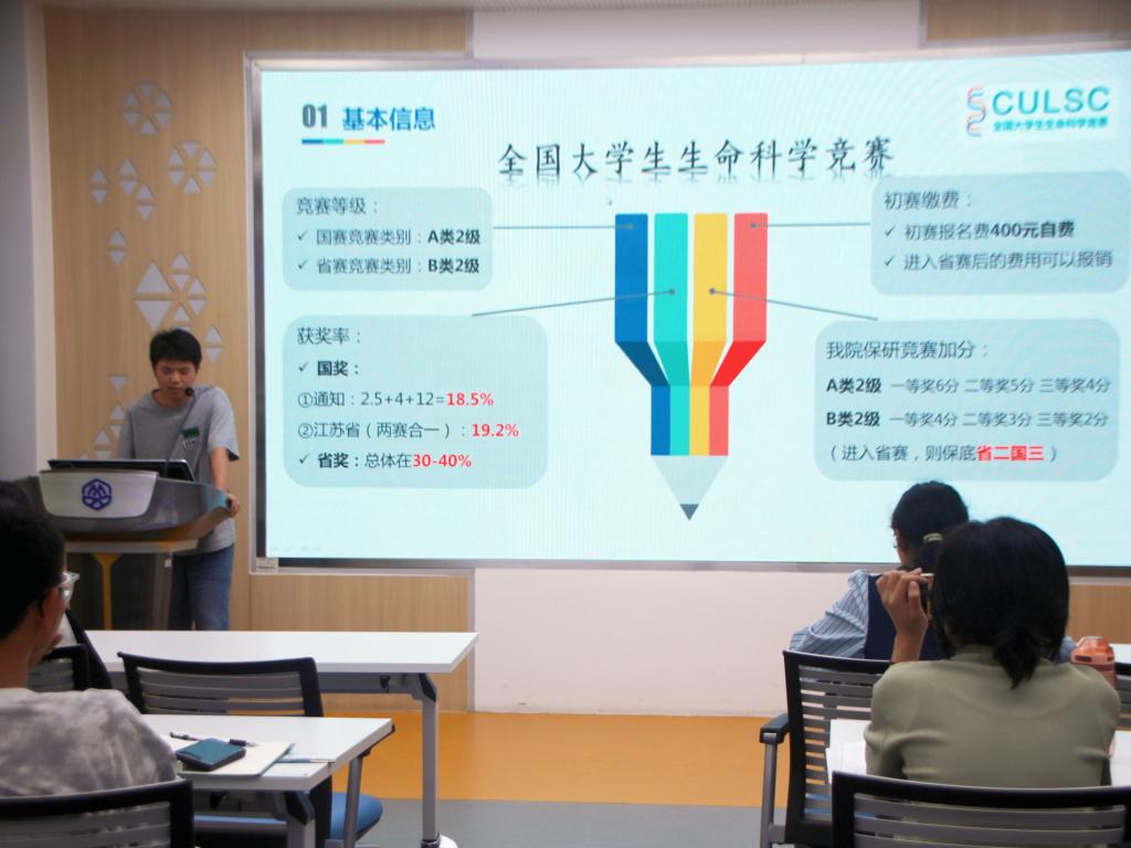 曾获第九届全国大学生生命科学竞赛中斩获国家三等奖(创新创业类)和省三等奖(科学探究类)的王烁从竞赛内容和形式切入,结合创新组和创业组两个赛道的参赛经验,精心补充完善竞赛流程细节,并强调了参赛条件及材料递交的注意点,着重指出竞赛的时间安排和提交流程。如同一位细心的引路人,深化了同学们对竞赛的理解。