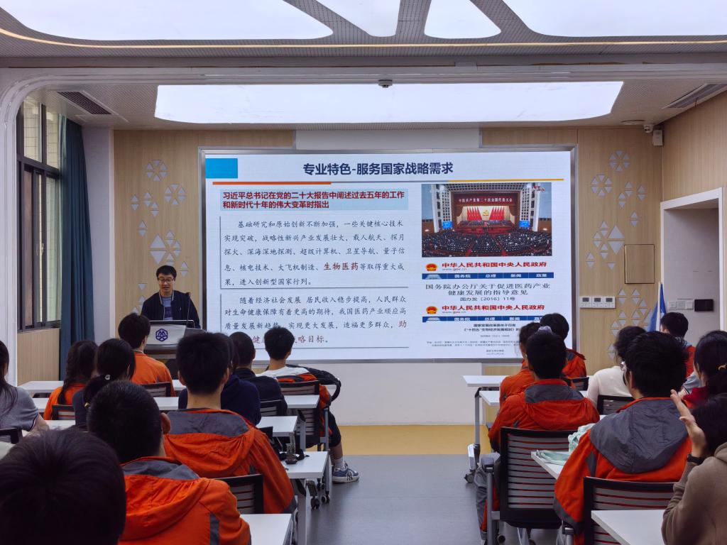 活动邀请学院院长助理杨朋、邵安东两位老师为同学们作学院情况介绍和专业科普讲座。两位老师以“什么是药物”“药物是怎么发现的”为引,和同学们分享了中国医药工业的发展,结合国家提出的“健康中国”战略,分享了学院的发展历程、学科建设、人才培养、科学研究以及社会服务情况。