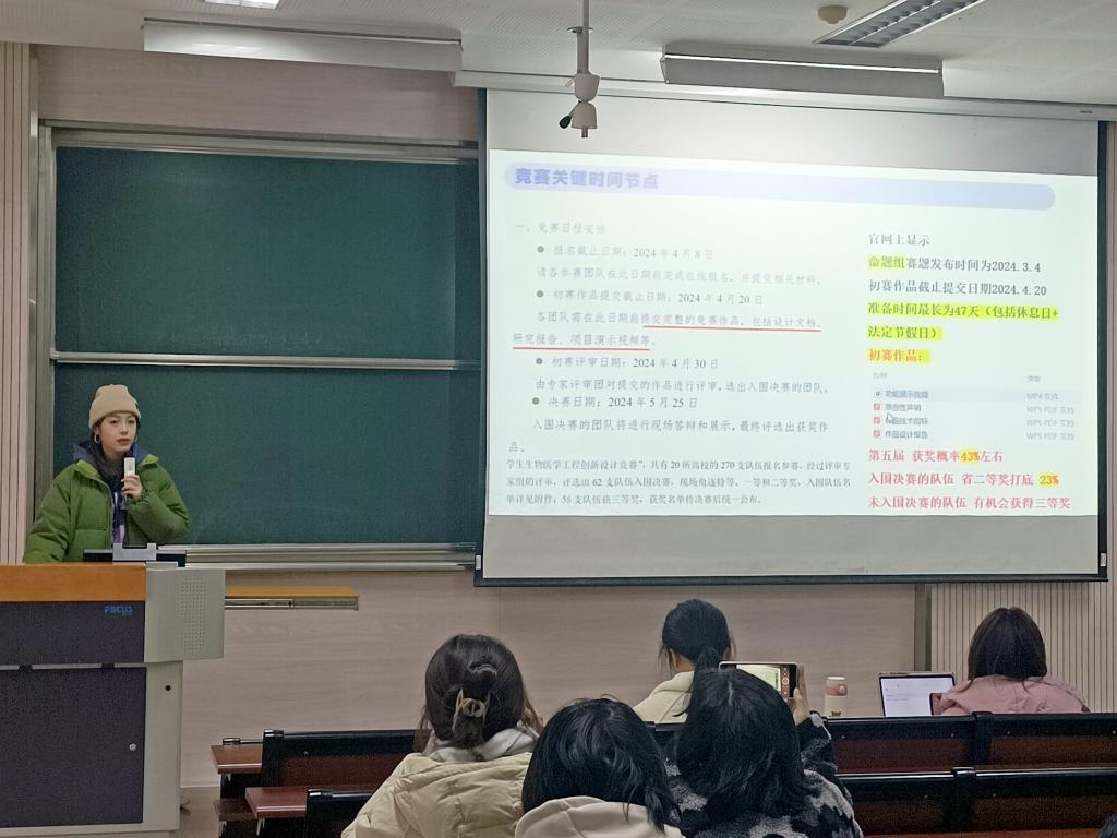 知识改变命运,竞赛铸就英才。为鼓励同学们积极投身学科竞赛,引导学生在竞赛活动中“立大志,成大才,担大任”,生命科学与健康工程学院于11月27日下午在2教2C203成功举办了生医赛、国药杯经验分享会。会议邀请学生嘉宾贾础宁、崔瑞轩进行经验分享,她们带着宝贵的经验与精辟的总结,为我们带来了一场知识与智慧的盛宴。本次会议由科协部王慧青主持。