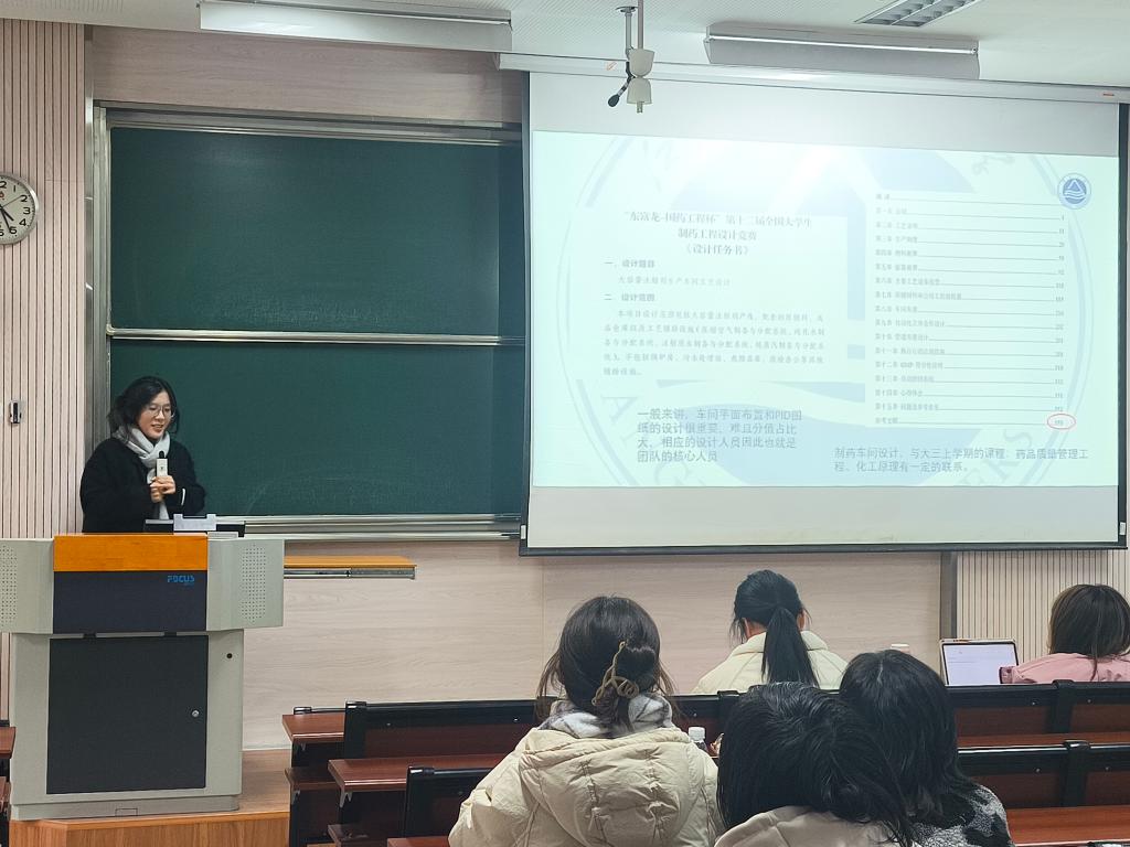 接着是国药杯一等奖获奖队伍队长崔瑞轩同学进行有关国药杯的经验分享。首先,她为我们介绍了获奖小组的课题。其次,围绕两个方面介绍参赛事项。关于书籍,她为我们推荐了四本重要的书籍,分别是制药工程工艺设计、GMP、药厂设备及工艺化设计、药物制剂生产设备及车间工艺设计,其中GMP是重中之重;关于团队建设,她强调团队最多六人,涉及CAD、3D建模的使用,并且建议同学们跨专业组队,咨询专业工程师。最后,她感谢课题组的同伴,成功之路并不是一帆风顺,尽管在过程中遇到了许多困难,但他们一直坚持,互相鼓励,彼此陪伴,一起将微毒的日子化为甘酒。崔瑞轩同学的分享生动有趣,使同学们对国药杯有了更深入的了解。