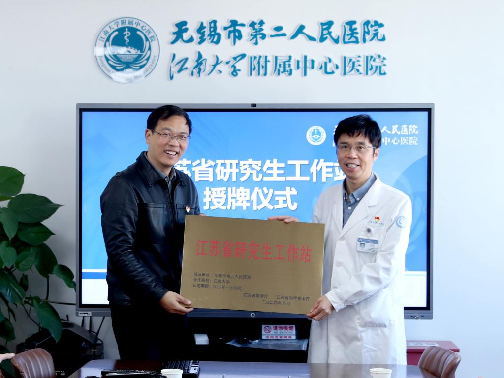 12月24日,江南大学生命科学与健康工程学院党委书记史志洪、院长尹健带队,副院长吴静、院长助理邵安东、办公室主任杨扬一行前往无锡市第二人民医院(江南大学附属中心医院)举行江苏省研究生工作站授牌仪式。此次合作标志着双方在人才培养、科研创新等领域的深度融合,开启了医教协同发展的新篇章。