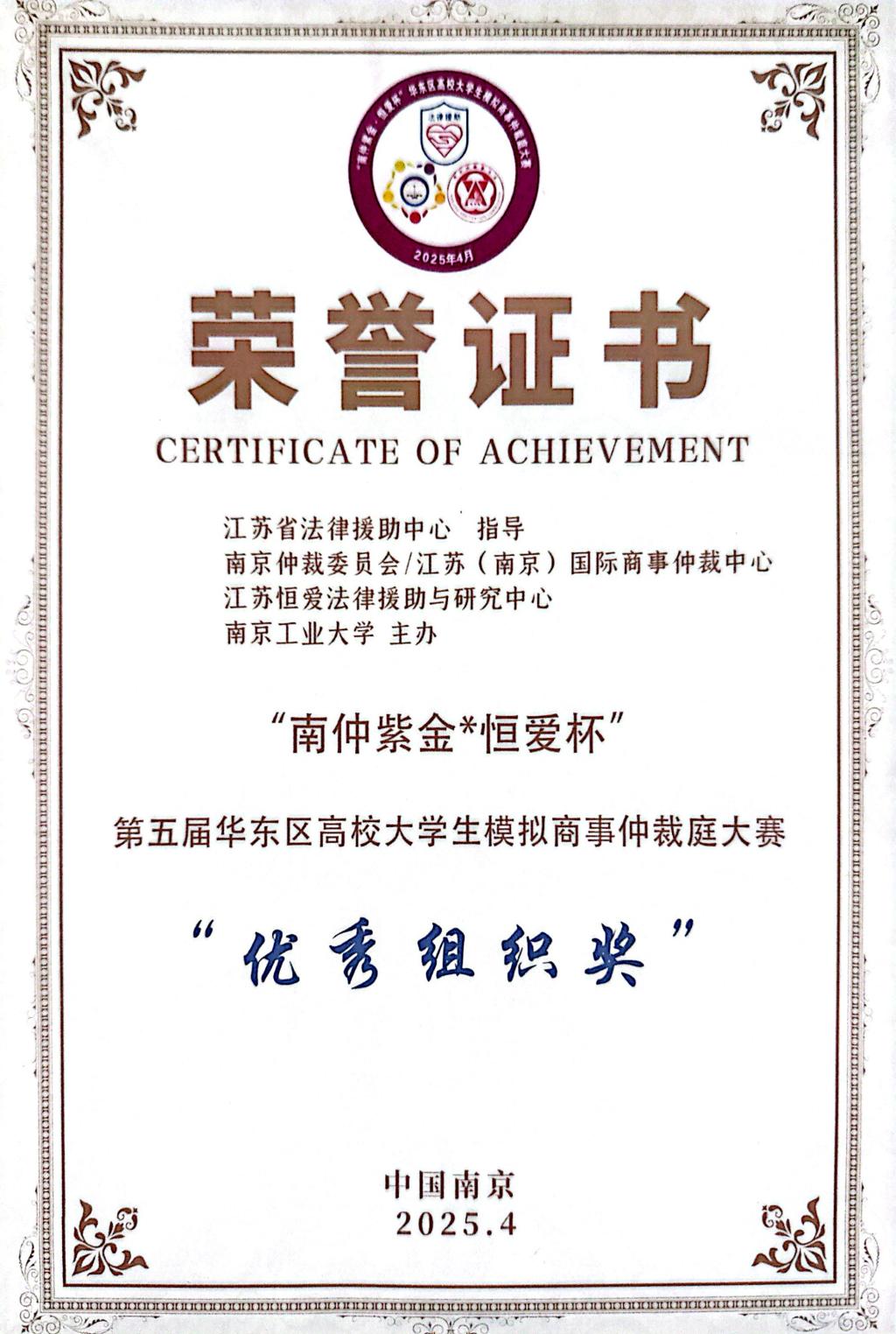 近日,第五届“南仲紫金·恒爱杯”华东区高校大学生模拟商事仲裁庭大赛在南京工业大学举办,来自华东地区的南京大学等22所高校的66支队伍参赛。江南大学法学院代表队荣获季军、优秀仲裁文书及优秀组织奖。
