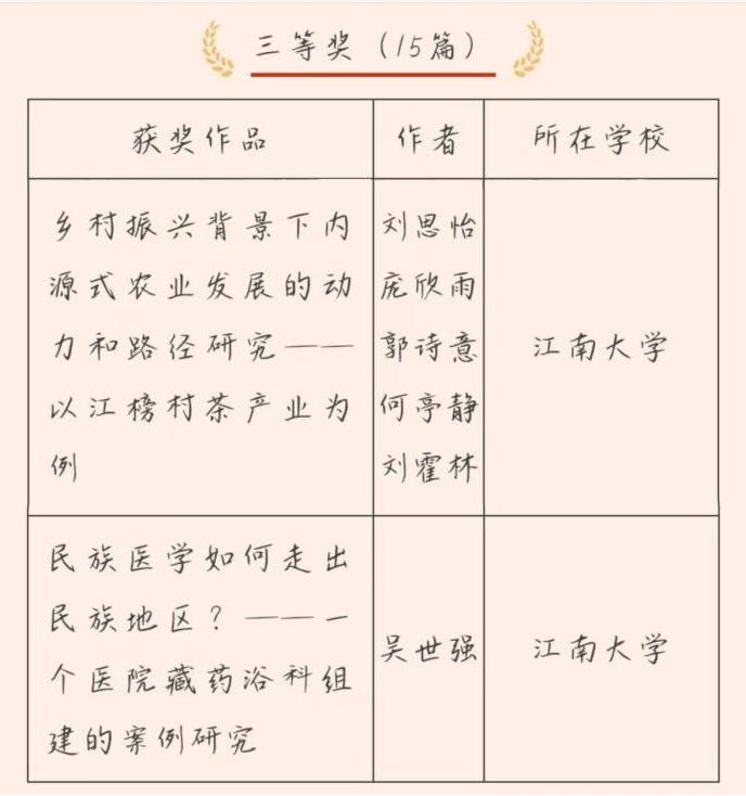 本次比赛内容涵盖了农业历史梳理、乡村现象、产业分析、治理探讨等领域,充分体现了“走进田野、深入社会、探寻真知”的赛事初衷。由刘思怡、庞欣雨、郭诗意、何亭静、刘霍林撰写的作品《乡村振兴背景下内源式农业发展的动力和路径研究——以江榜村茶产业为例》创新性地将内源式乡村发展理论与农业转型结合,深入探究推动农业转型的社会基础和实践机制。研究发现当地社会主体之间的协作促进了正式与非正式组织之间的融合,形成了内源式的乡村产业合作模式,这种深植于熟人社会的合作模式展现出更为显著的成效;由吴世强撰写的作品《民族医学如何走出民族地区?——一个医院藏药浴科组建的案例研究》通过引入嵌入性理论,分析了藏药浴在现代医疗体系中的制度嵌入、技术适应和文化转译机制。研究发现通过制度网络的协商共建、医疗实践的标准化重构及文化符号的策略性转译,藏药浴成功实现了从文化他者到医疗共同体的身份转换。