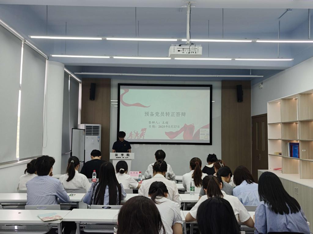 为严把党员发展质量关,强化党员责任意识,5月27日下午,法学院2025上半年预备党员转正答辩会分别在法学院A449与B105会议室举行,对预备党员在预备期间的表现进行全面考察。本次答辩评委小组由党建辅导员缪晶晶,党支部支委代表唐刚、夏段阳、许佳新、李涵、史胜男、赵常鸽、黄灿炜、陈彧嘉组成,42位预备党员同学参与了答辩会。答辩会现场答辩会分为个人陈述、现场问答和评委评审三个环节。
