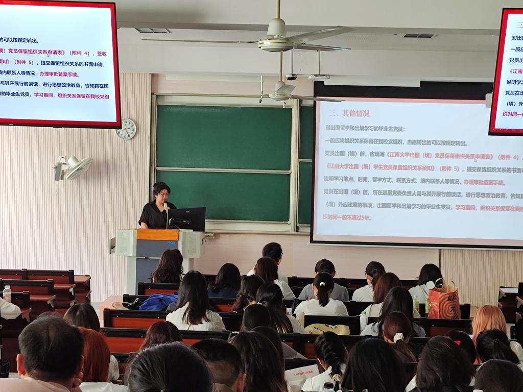 首先,胡博作“严守纪律 不逾底线”主题教育。胡博结合理论武装和案例分析,引导毕业生党员正确认识政治纪律、组织纪律、廉洁纪律、群众纪律、工作纪律和生活纪律,加强党性修养和廉洁自律意识,做到知敬畏、存戒惧、守底线,扣好廉洁从业“第一粒扣子”。随后,缪晶晶就毕业生党组织关系转接流程进行详细讲解,结合《党员组织关系管理手册》等文件明确组织关系转接的基本流程、常见问题及注意事项,并提醒毕业生党员要在规定时间内办理好党组织关系的转接工作。她强调,党组织关系是政治身份的体现,必须严肃对待、规范转接,不得遗失或延误,确保“组织不断线、身份不脱节”。