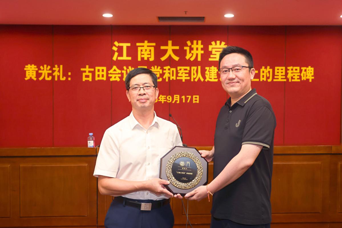 讲座伊始,陆秦为黄光礼颁发“江南大讲堂”讲座嘉宾荣誉牌匾。