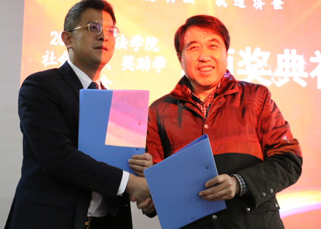 1月9日,法学院2018年度“社会奖教、奖学助学金颁奖典礼”于文浩馆205会议室成功召开。江苏海辉律师事务所合伙人许雪松律师、杜一律师、朱佳丹律师,无锡市新吴区社会工作协会王文进秘书长、彭颖(项目负责人),君澜(无锡)律师事务所创始人瞿俊鹏律师、任华律师、张咪律师,法学院党委书记杨杰、党委副书记张慧琪、副院长王君柏及师生代表近200人参加了本次典礼。颁奖典礼由张慧琪主持。