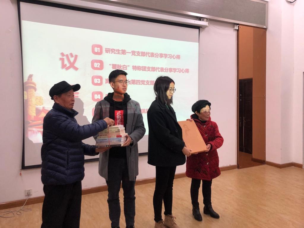 王永南、王崇英代表离退休处龙山第四党支部给法学1701“瞿秋白”特称团支部赠与“纪念瞿秋白题词书画集”等系列书籍,对他们寄予厚望。