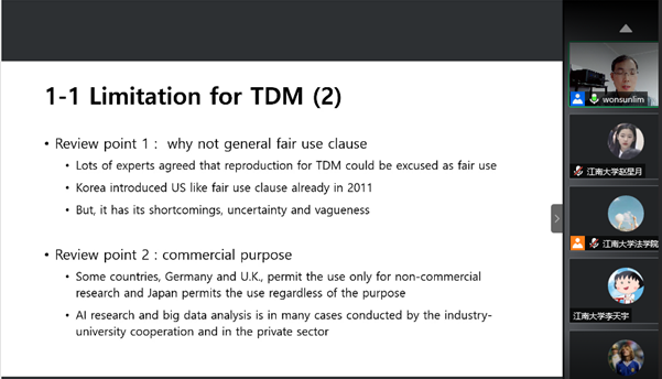 当今世界,文化软实力是综合国力的重要组成部分,因此作为文化领域基本法的著作权法越来越受到重视。中国2020年对《中华人民共和国著作权法》进行了第三次修改,并于2021年6月1日起正式开始实施。作为世界范围内文化产业较发达的国家之一,韩国的国际影响力也正处于逐步巩固和发展之中,其间著作权的引领和保护对此产生了重要作用。面对第四次工业革命带来的发展契机,韩国政府也着手准备著作权法的全面修改。4月22日,法学院邀请到了韩国国立江原法学院林文善教授给学生们举行在线讲座,详细解读韩国著作权法修改过程中的诸多要点。林文善在韩国版权部门工作了30多年,曾任韩国版权局局长、韩国国立中央图书馆馆长和韩国著作权委员会委员长等职务,且以外交官的身份在世界知识产权组织担任过高级顾问等职务,在著作权法和著作权政策方面浸淫多年。法学院王君柏院长,叶敏副院长等多位老师参加了本次会议。