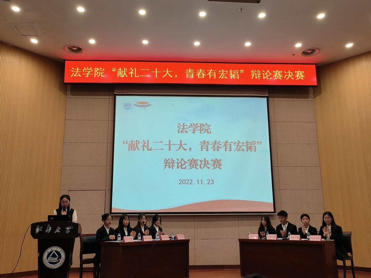为加强校园文化素质教育,培养学生逻辑思维与表达能力,促进德智体美劳全面发展,11月23日下午,法学院2022年新生辩论赛总决赛在远东报告厅顺利举行。法学院党委副书记、副院长张慧琪,法学院教师徐钝、周悦、孙青山,辅导员徐雅静、孟飞、缪晶晶,各辩论队负责人以及200余名学生参加了本次活动。
