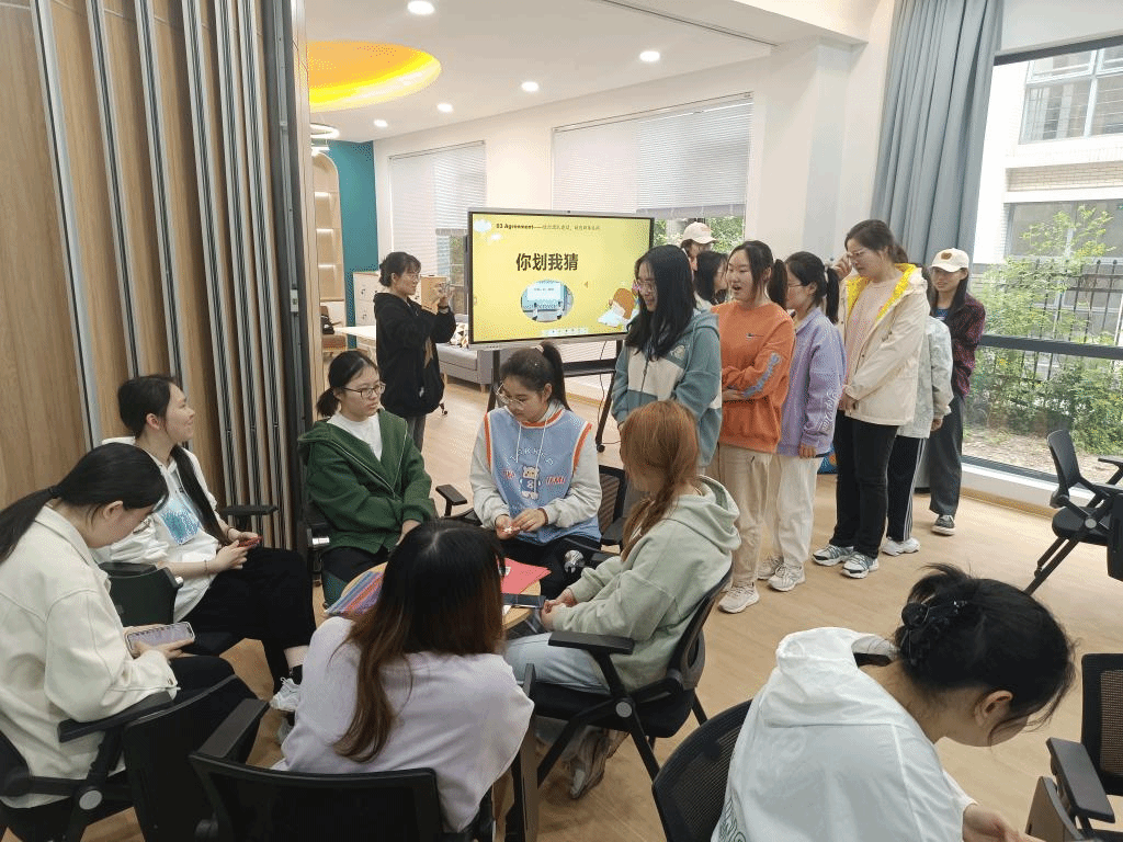 活动开始,以“绘出我的人际关系网”为题,引导让学生学会梳理自己的社会关系。伴随轻松愉悦的兔子舞音乐,同学们手牵手、肩并肩进行热身与破冰运动。接着,“同心圆、面对面”活动中,同学们跟随音乐节点认识新朋友们,一句句问候拉近彼此的距离。“你划我猜”围绕太湖、金字塔、书籍、帆船等元素进行集体合作,最终谜底揭晓,每个元素汇集成江南大学校徽,寓意着大家由个体相聚太湖之滨,希望珍惜来之不易的缘分,树立集体意识。在“搭建我们的房子”游戏环节,学生们在小组中开展合作,建设小组的队名、队徽和团队口号并使用卡纸、吸管、画笔等搭建理想中的房子,同学们齐心协力,异彩纷呈,一座座精美的“房子”经过共同的努力展现在大家面前。最后,缪晶晶对本次活动进行总结。