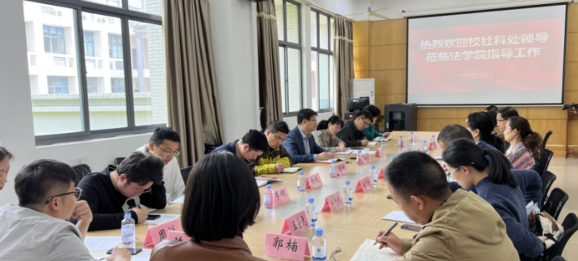 4月26日上午,社会科学处长王建华、副处长杨恋恋、综合科科长潘泳、基地科科长史华伟一行来到法学院,就学院科研工作进行调研。法学院党委书记陆敏芝,院长王君柏,副院长李俏、叶敏,重点学科负责人和方向带头人、科研平台负责人、中青年骨干、科研秘书等14人参加此次座谈会。会议由叶敏主持。