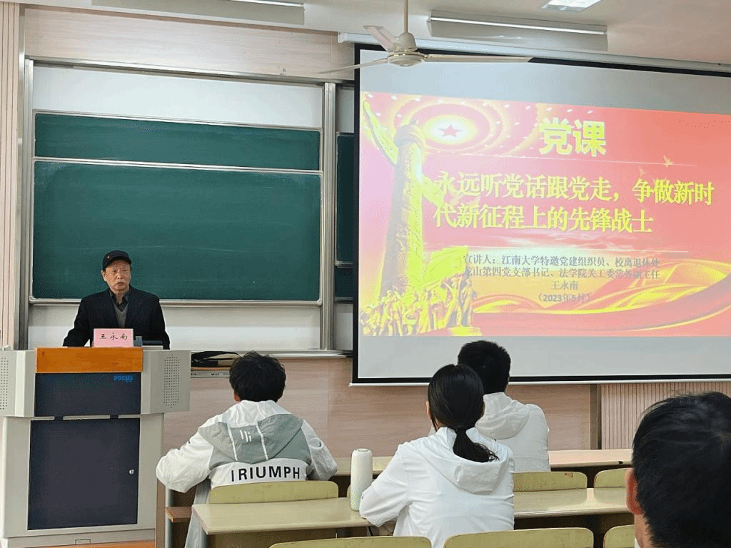 为增强新一批积极分子的党性修养,强化对党的路线、方针、政策的基本认识,法学院、机械工程学院于5月10日在二教2C211教室联合开展了入党积极分子培训班第一讲“永远听党话跟党走,争做新时代新征程上的先锋战士”主题党课。本次党课由江南大学特邀党建组织员、校离退休处龙山第四党支部书记、法学院关工委常务副主任王永南主讲。