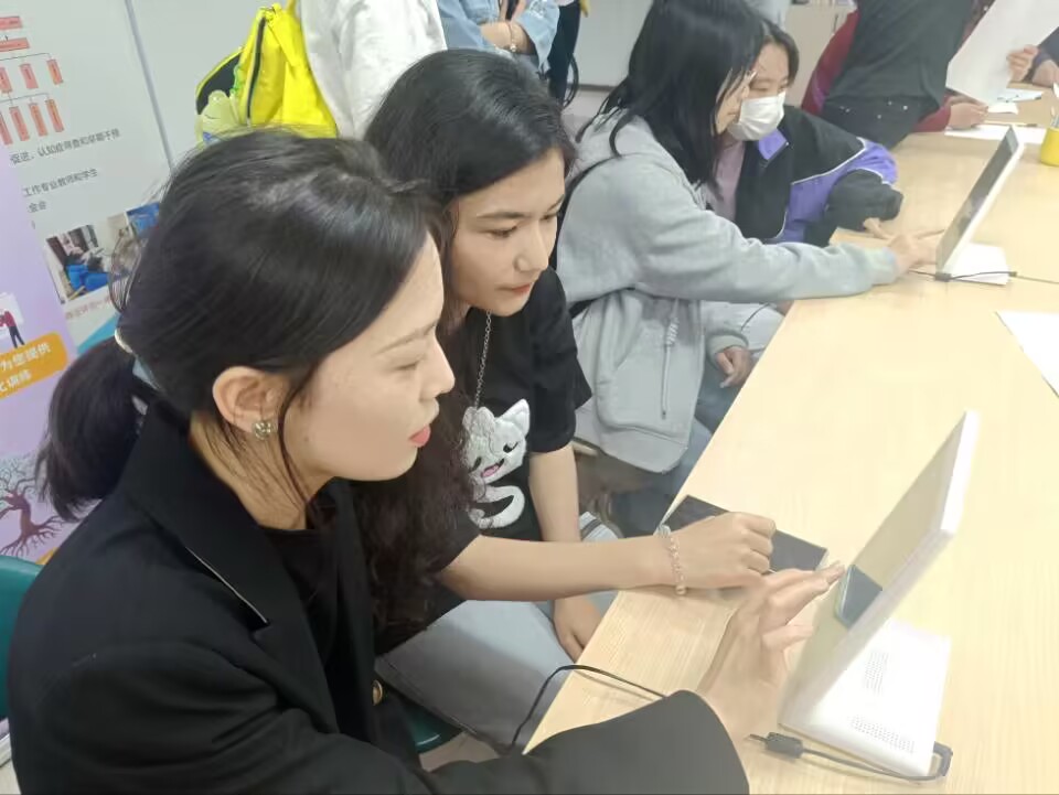 师生一行走进丽新社区居家养老服务站,李娟对丽新社区预防认知障碍项目建设情况进行介绍,讲解了预防老年人认知障碍的重要性,并展示了社工站的认知训练设备。在缪晶晶引导下,团队成员结对体验“图形记忆”“消除麻将”等趣味认知训练游戏,并进行了认知能力测试。体验结束后,团队成员共同交流了感受,李娟为同学们答疑解惑。