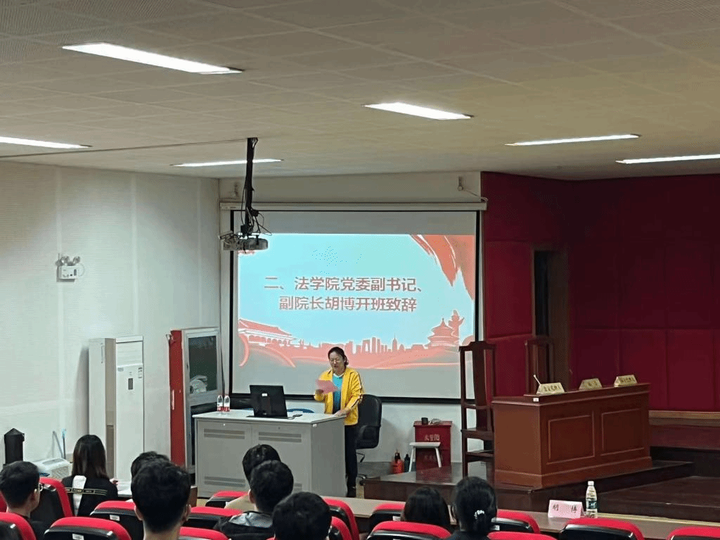 法学院党委副书记、副院长胡博进行开班致辞,她祝贺本期分党校的顺利开班,引用党的二十大报告中关于青年的话语,对学员们寄予了厚望;第45期分党校优秀学员代表金钰发言,号召同学们努力向党组织靠拢,随后她将党旗授予第46期分党校学员代表管琳敏,全体学员郑重宣誓;最后,由孟飞布置党校的安排和要求,讲解发展对象培训的细则。