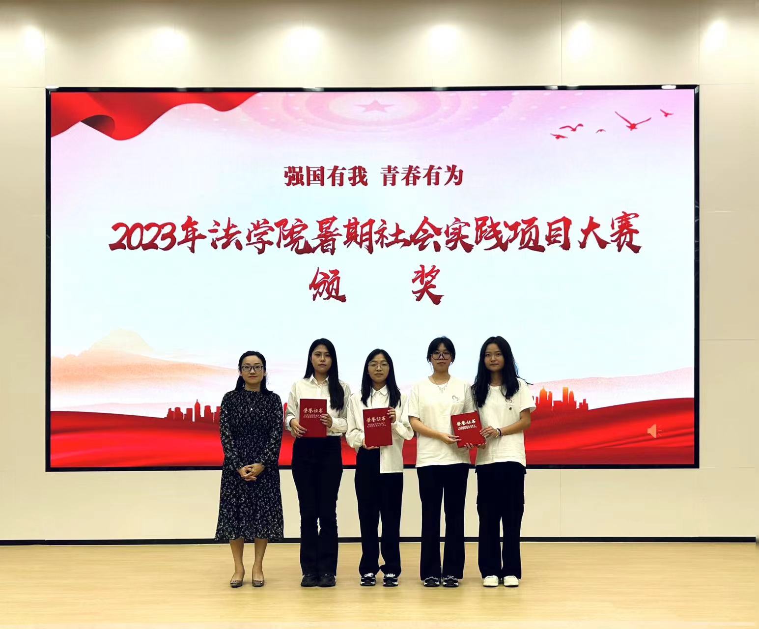 接下来,进行法学院2023年暑期社会实践项目大赛颁奖暨成果展示环节。法学院红粉笔支教团坚守“红心筑梦,粉笔传爱”的理念,将青春志愿的火种播撒到大山深处,为乡村振兴贡献蓬勃力量;益治青春基层治理实践团以“青春之我,助力中国之治”为行动理念,瞄准基层服务需求开展菜单式、定制化志愿服务,两支团队荣获特等奖;乡缘益青小分队探析乡村振兴视域下法治乡村建设现状,积极寻求其摆脱困境的出路,助力乡村振兴,荣获一等奖。情系桑榆实践团队秉承敬老爱老初心,关注老龄事业发展,以青春之力扬时代新风;问山实践团队通过实地调研,希望从教育、社会、政府三个维度探寻我国东部地区少数民族乡文旅发展途径及方向,两支队伍荣获二等奖;法“治”杀熟社会实践团队,网络化调研实践团,领航青春·司法社工实践团,三山六岳队,“益”心呵护、伴你“童”行实践团荣获三等奖。12支优秀社会实践团队分享了他们的宝贵经验,充分展现了法学院学子聚焦基层、关注民生的独特角度和善于践行真知,积极向上的精神风貌,给2023级新生树立了勇担社会责任、展现青年风采的榜样。