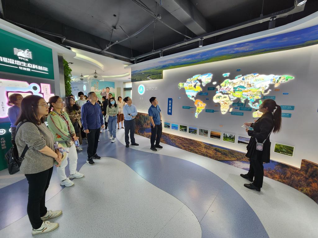 首先,师生一行一起来到无锡湿地生态科普馆。无锡湿地生态科普馆是依照生态文明教育实践基地专门打造,集宣传、科普、教育于一体的湿地生态修复成果展示窗口。在专职讲解员的带领下,法学院师生在集声罩下倾听来自世界十大湿地的鸟叫虫鸣;在太湖治理专区了解太湖水体恢复历程及如何解决由蓝藻带来的居民饮用水问题;在湿地生态互动展厅,结合图片解说和静态标本,了解太湖湿地各种鸟类、虫类、鱼类、湿地植物及湿地微生物;在巨幕投影前观看各类水鸟动态,了解珍稀水禽的繁殖迁徙与湿地的紧密关系;最后在无锡湿地学校风采录,了解湿地保护与学科教育的融合情况,让大家对湿地有进一步的认识,激发大家爱护生态、保护生态的意识。随后,师生们一起参观了无锡湿地生态科普馆西侧的“水上森林”,水面上树木高耸挺拔,水面下湖水清澈见底,森林间有若干小岛通过栈桥连接。专职解说员向大家介绍了水生态系统的构建情况,了解到“水上森林”生态湿地的打造是多年技术积累与自然循环系统共同营造的可喜成果,通过专业讲解,法学院师生亲身感受到了无锡太湖治理久久为功带来的生态福祉。最后一站参观贡湖湾湿地公园这片绿色生态区最具代表性的地方——水韵广场。水韵广场南临太湖,北接贡湖湾湿地,呈现了贡湖湾的新面貌、新气象,展现了生态文明建设的重要性。