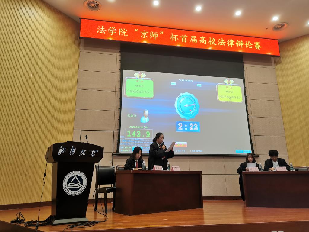 为培养学生逻辑思维、表达能力以及团队协作能力,深化五育融合,丰富校园文化生活,11月15日下午,法学院联合北京市京师(无锡)律师事务所举办的首届“京师”杯高校法律辩论赛在远东报告厅顺利举行。法学院党委副书记、副院长胡博,京师无锡律所合同法律事务部主任王苏皖、青工委主任助理陈文俊、青工委委员毛鉴明、律所辩论队队员戚海州,法学院法律系副教授郭楠、万艺,法学院分团委书记徐雅静,辅导员孟飞、帕日旦木出席本场比赛,法学院200余名学生参加了本次活动。
