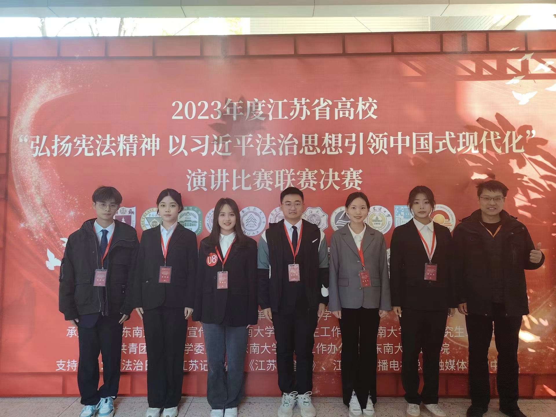 近日,江苏省高校“弘扬宪法精神 以习近平法治思想引领中国式现代化”演讲比赛联赛决赛在东南大学九龙湖校区举行,来自全省入围决赛的14所高校参赛。法学院法学专业2021级郑恩予,2022级马千越、李锴诺,2023级陆家龙、朱晏昕,社会工作专业2023级于金卉代表我校参赛,获得了三等奖,江南大学法学院荣获优秀组织奖。