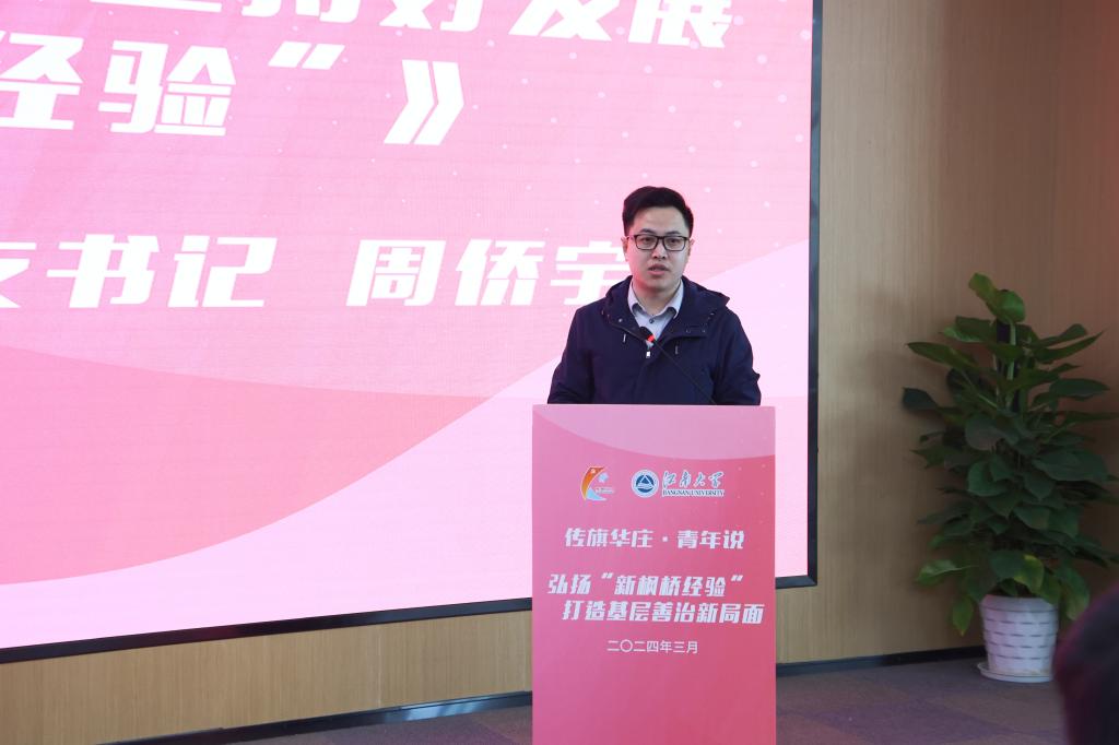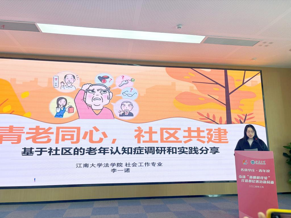 本次活动在共学“新枫桥经验”党课中拉开序幕,景贤社区党总支书记周侨宇带来的微党课《在社区治理新实践中坚持好发展好新时代“枫桥经验”》畅谈基层治理“微”故事和“心”感悟,动员青年干部要以排头兵姿态把“新枫桥经验”坚持好、发展好,把党的群众路线坚持好、贯彻好;法学院社会工作2202班团支书闫嵩涵以《“青”力而为,基层有我》为题进行分享。她将从枫桥经验的历史渊源、实践探索、青年担当三个方面进行阐释,展现不同时代基层治理中源源不断的青春动能,号召新时代青年“到基层去,到祖国和人民需要的地方去”,立志在基层事业建设中践行历久弥新的枫桥经验;23级农村发展团支书周心如以《用青春守护最美夕阳红》为主题进行分享,她认为让老年人安享晚年,既是“家事”,也是“国事”,是老年人对美好生活的热切回应。以“90后”人大代表李楠楠积极投身养老事业为例,鼓励大学生青年积极为养老服务人才队伍注入新的活力,为我国养老事业贡献青春的力量。