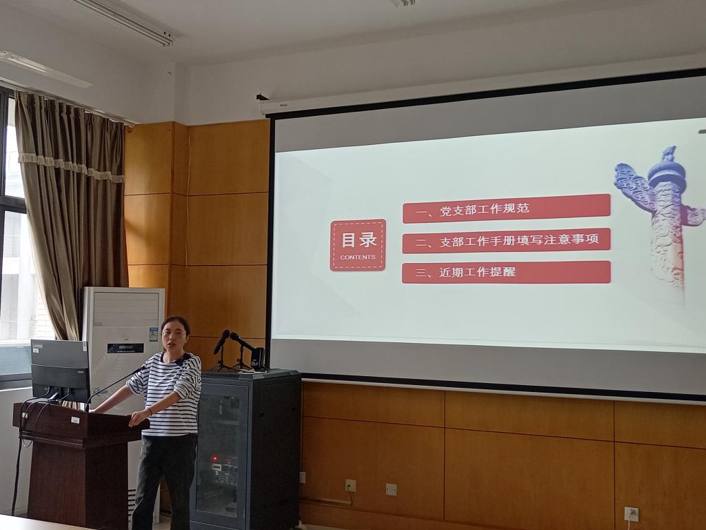 专职组织员陆芳老师为同学们做支部建设和支部工作手册的专题培训。她详细讲解党支部的工作规范,包括党支部工作的八大任务,并针对“三会一课”的具体内容和要求进行了详细解读。陆芳老师强调支部工作手册作为党支部工作的重要资料档案,是党支部组织活动开展的真实记录,要记录规范、完整,并根据日常工作和专项检查中发现的共性问题,对同学们进行重点指导。